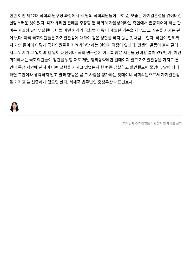 [ 2024. 6. 26. ] [ 대전일보 ] " 자기일관성을 가져야 한다 " 페이지 정보 작성자 법무법인충청우산 작성일 24-06-28 09:46 조회 723회 댓글 0건 본문 출처 : https://www.daejonilbo.com/news/articleView.html?idxno=2139443 이전글[2025. 4. 25.] 서재국 대표변호사 '형사법 전문분야 등록' 다음글[2024. 5. 29. ] [ 대전일보 ] [서재국대표변호사] '국회의원 당선자에게 바라는 것' 목록 답변 댓글목록 0 댓글목록 등록된 댓글이 없습니다.